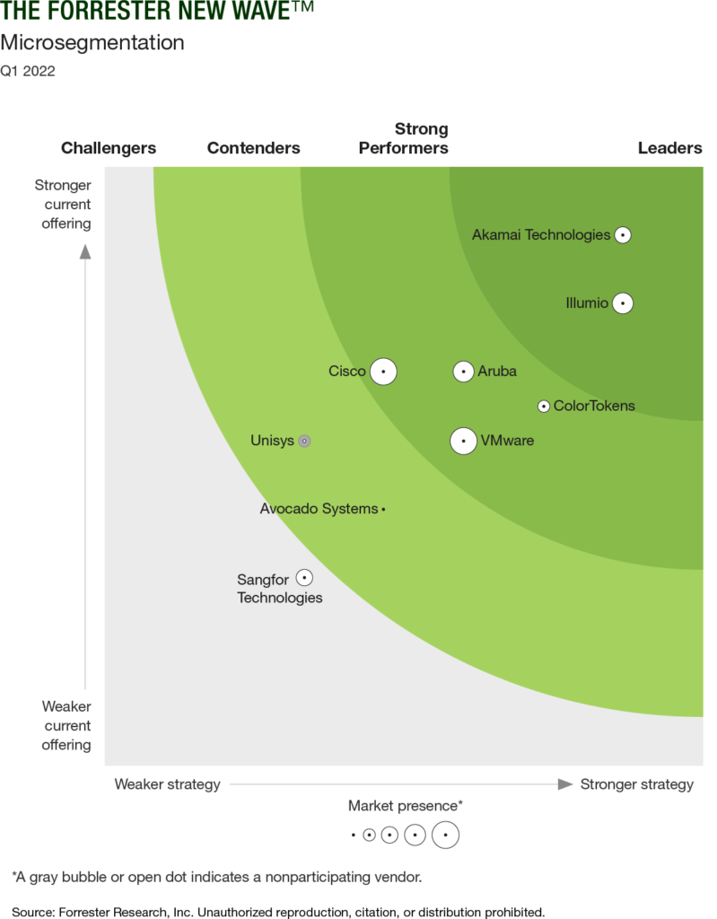Forrester провела оценку девяти ведущих поставщиков микросегментации, включая таких гигантов безопасности, как Cisco и VMWare, а также Illumio, ColorTokens и других. Guardicore был признан лидером в сфере микросегментации, получив дифференцированный рейтинг, в том числе максимально возможный балл по семи критериям. Эта оценка подтверждает инновационный подход Akamai к микросегментации с нулевым доверием.